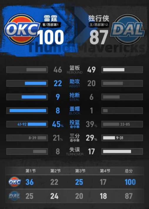 全场具体比分(独行侠队在后):36-25、22-24、25-20、17-18。