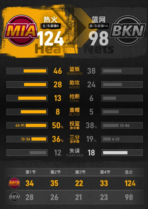 全场具体比分(热火队在后):28-34、26-35、21-22、23-33。