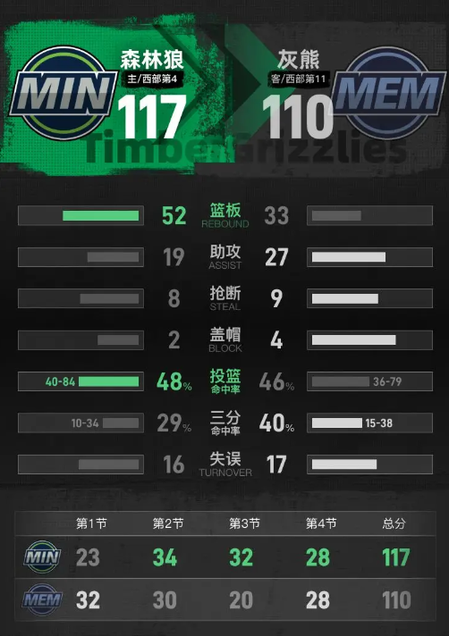 进入第四节,森林狼继续保持良好的竞技状态,开局打出一波进攻,将优势扩大至17分。灰熊在节中阶段展开反击,将分差缩小至4分。然而,森林狼保持着稳定的进攻节奏,逐步将优势再次拉开。爱德华兹在本节中贡献了13分,其中包含了三记三分球,而灰熊的考沃德也获得了10分,包括一记三分球。最终,森林狼以117-110赢得了比赛。