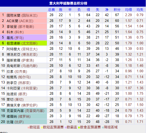 意甲积分榜:国米负米兰仍领先7分 科莫罗马尤文争四