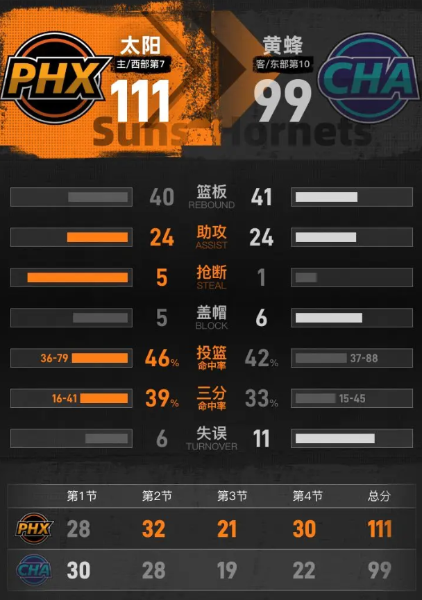 第四节开始后,弗莱明连续内线外线取分,吉莱斯皮连中两记三分,太阳逐渐拉开分差,比赛还剩6分钟时太阳已经领先13分。黄蜂依靠鲍尔和威廉姆斯连续命中三分追分,太阳保持稳定进攻输出,布克连续得分后,吉莱斯皮再中三分把分差拉开到16分。最后阶段,布克罚进技术犯规罚球,布里奇斯终场前上篮得分,太阳主场111-99击败黄蜂。