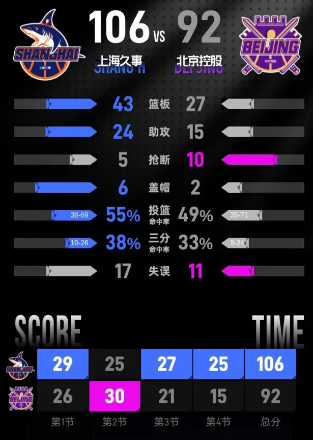 进入第四节比赛,李添荣开场连得四分,怀特塞德篮下再添三分,上海将分差扩大到9分。偰李永炜三分命中,李添荣跟进上篮得手,上海打出12-4的攻击波,分差拉开到13分。张镇麟状态火热,连续篮下得分加上抛投命中,很快将分差扩大到18分。北京控股多次尝试追分,邹雨宸、杜伯超接连篮下得分,分差始终维持在两位数。最后时刻金鑫两罚全中把分差缩小到12分,闫鹏飞两罚全中锁定比分,上海久事主场拿下胜利。