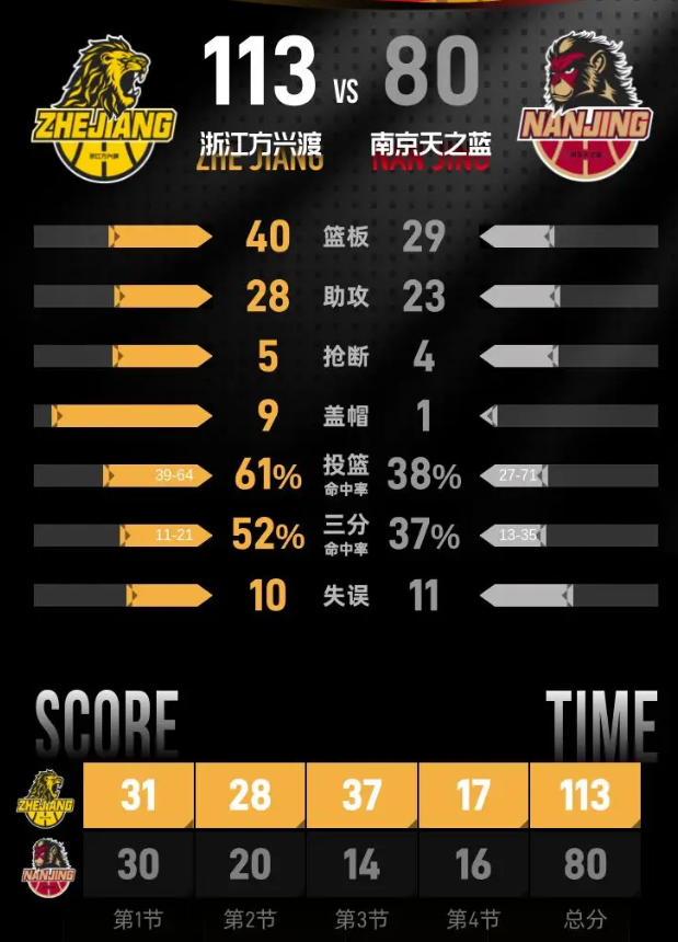 进入第四节比赛,浙江换下全部主力轮换出战,双方各有得分。张新宇两次跳投得分,姜贺也拿下四分,浙江这边赵嘉仁和赵岩昊接连得分,赵岩昊连得五分把分差扩大到35分。之后刘奕杭命中三分,侯孟泽跳投得分,张新宇罚中一球,最终浙江主场113-80击败南京天之蓝。