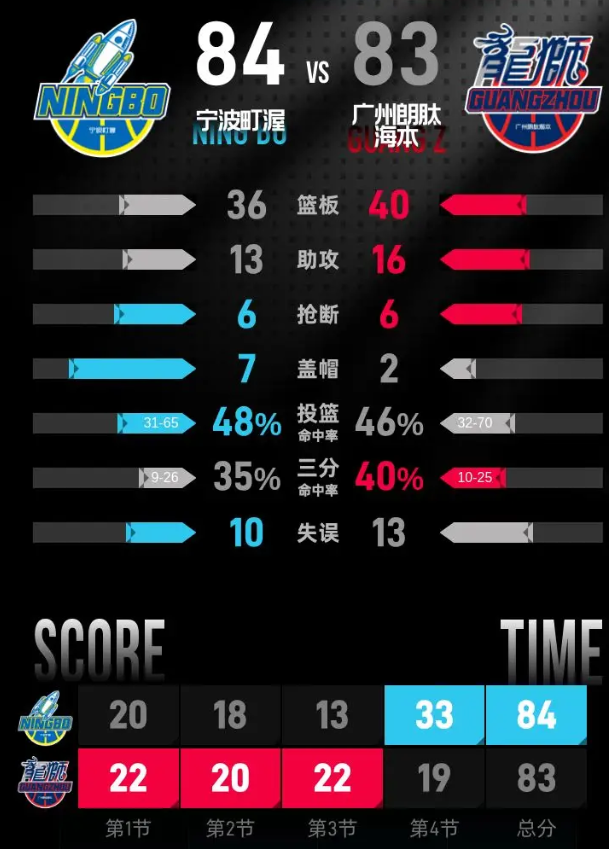 宁波町渥队:富兰克林·杰克逊29分2篮板2助攻、扎维尔·辛普森16分8篮板4助攻、宁鸿宇10分4篮板、达柳斯·贝兹利8分2篮板1助攻、塔克·法尔6分4篮板1助攻、王俊杰6分3篮板1助攻、王凡懿4分1篮板、罗凯文2分3篮板1助攻、鲁吐布拉2分3篮板、刘晓宇1分2篮板3助攻。
