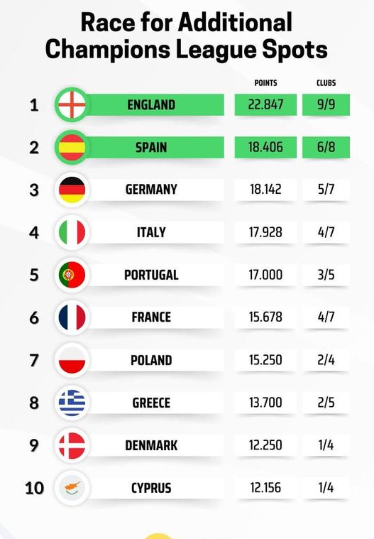 时间:2026-03-13 09:17:10北京时间3月13日,在欧冠、欧联杯以及欧协联1/8决赛首回合的比赛全部结束后,Football Rankings更新了本赛季各大联赛的欧战积分,本轮英超9支球队仅取胜1场,积分仅增加0.555分,但目前他们仍然高居第一,西甲和德甲则正在竞争另一个欧冠的额外名额。