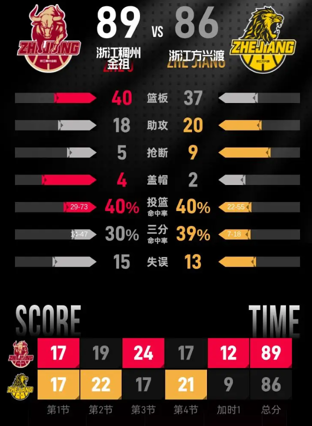 浙江稠州金租队:程帅澎27分2篮板2助攻、安德鲁·安德鲁斯19分6篮板3助攻、达卡里·约翰逊17分8篮板3助攻、陆文博12分4篮板2助攻、达米安·琼斯4分3篮板、布兰登·兰道夫3分1篮板、吴前3分4篮板3助攻、刘泽一2分5篮板3助攻、王仔路2分3篮板1助攻、李悦洲1助攻。