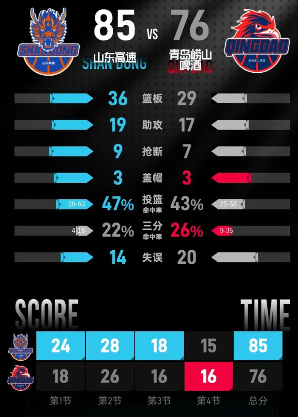 进入第四节比赛,米奇连续拿下6分缩小分差,之后米奇命中三分,段昂君两罚全中,青岛把分差缩小到5分。克里斯连续得分稳住局势,高诗岩两罚全中后,克里斯再跳投命中,山东把优势拉回到12分。王睿泽命中三分,王奕博接助攻上篮得分,青岛将分差缩小到7分。最后33秒克里斯稳稳两罚全中,最终山东高速主场收下比赛胜利。