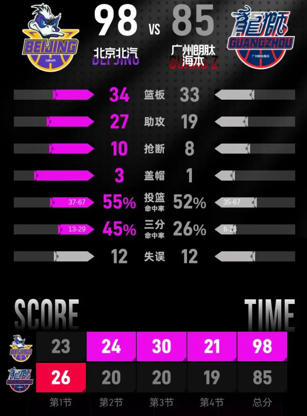 进入第四节比赛,麦基开局连拿4分,北京把领先优势扩大到15分。刘颜诚接助攻命中三分回敬,方硕很快连续两记三分命中,分差拉大到18分,麦基内线再得分,北京领先达到20分。广州没有放弃,伯顿突破上篮得分,袁照耀跟进上篮得分,陈国豪接助攻命中三分,将分差缩小到11分。陈盈骏两罚全中稳住局势,麦基接助攻灌篮再拿分,方硕在终场前7秒命中三分,把领先优势拉到16分。最后时刻伯顿接助攻命中三分,最终北京北汽客场98-85击败广州朗肽海本。