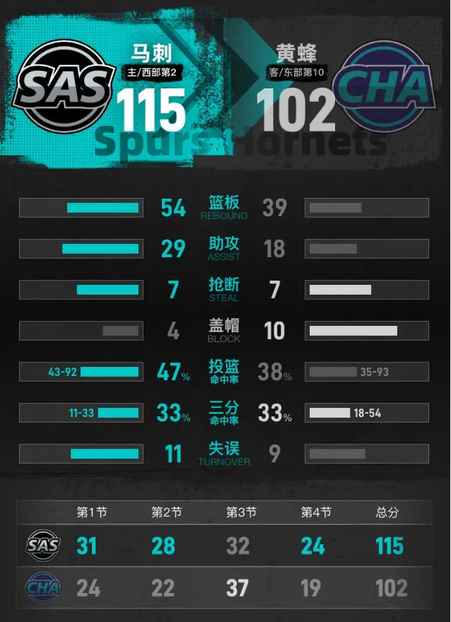 第四节开始后,布里奇斯率先勾手命中,随后投进三分把分差缩小到4分。约翰逊和文班亚马连续在内线得分重新拉开分差,瓦塞尔和布莱恩特接连命中三分,马刺再次把分差拉大到16分。最后阶段福克斯连续突破得分,文班亚马在比赛还有1分12秒时命中三分,帮助马刺把优势拉到19分。黄蜂最后时刻连续命中三记三分,马刺主场115-102击败黄蜂。