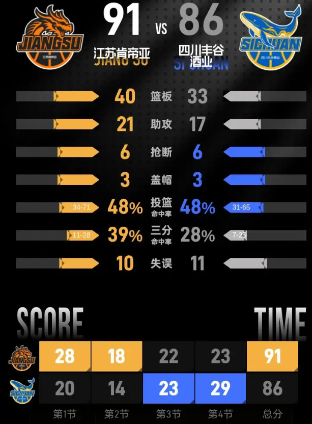 比赛进入末节,江苏开局连得5分,再次把分差拉到13分。景菡一带领四川发起追分,多点开花后,在比赛还剩3分多钟时把分差缩小到5分。庞峥麟接斯塔克斯助攻投进三分稳住局势,卡迪姆·赛回敬三分后,双方分差一直维持在5分左右。最后时刻四川疯狂追分,比赛还剩3秒时景菡一接赵芮助攻投进三分,把分差缩小到3分,四川迅速采取犯规战术,亨特两罚全中,最终江苏肯帝亚以91-86击败四川丰谷酒业。