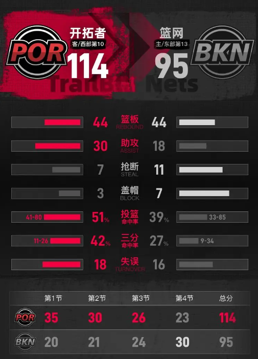 第四节开始后,篮网抓住开拓者轮换阶段的机会发起追分攻势,萨拉夫状态火热连续得分,沃尔夫命中三分后又完成快攻,不到三分钟篮网打出一波10-2的攻击波,将分差缩小到15分。开拓者及时调整,依靠罚球和内线进攻稳住局面,始终没有让分差进一步缩小。比赛末段,开拓者换上全替补阵容,塞布尔命中三分,肯特和韦斯利接连篮下得分,最终开拓者客场114-95击败篮网。