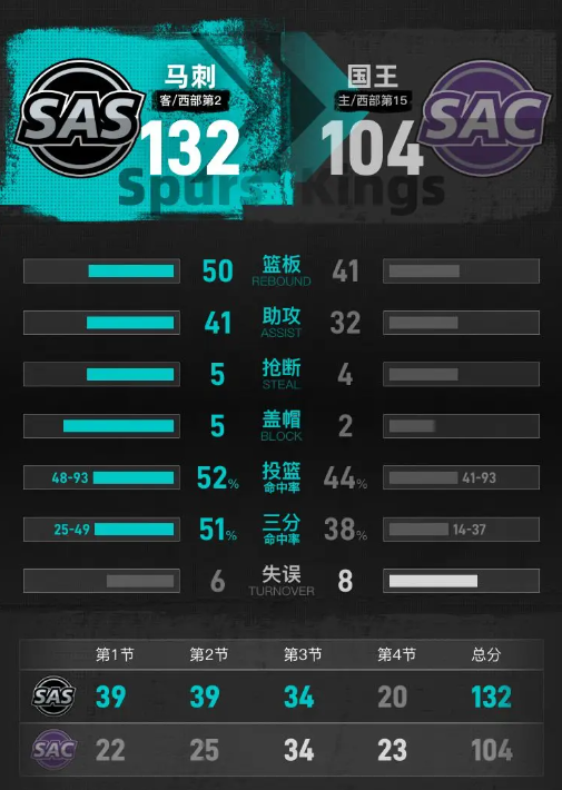 马刺半场三分线外把握极高,多位球员找到进攻状态,早早建立起30分的巨大优势,国王进攻端只能依靠零星得分追赶,未能缩小分差。