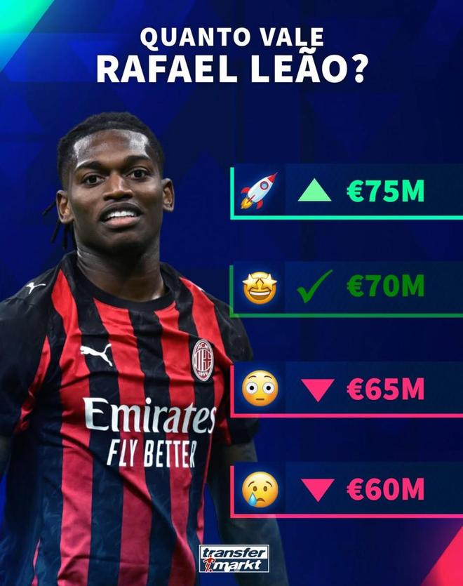 北京时间3月17日,德转预热了AC米兰前锋拉斐尔-莱奥的身价更新,他们给出了四个选项,最高涨至7500万欧元,最低跌至6000万欧元。