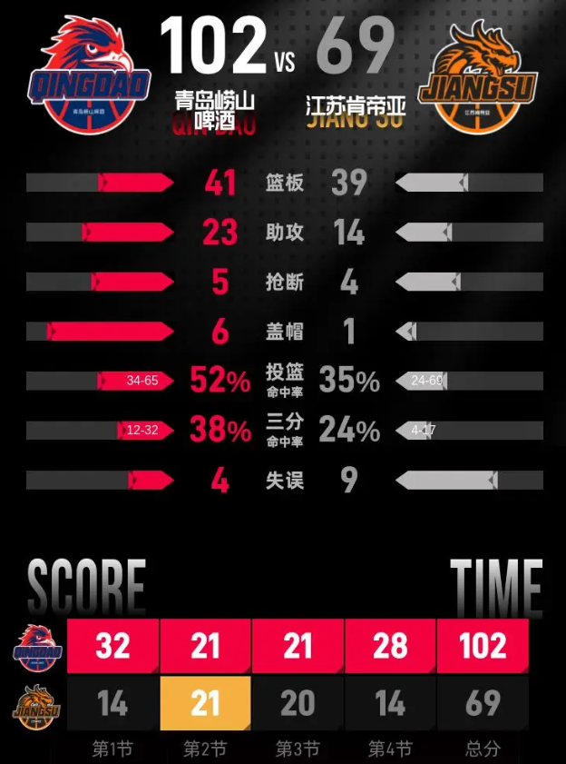 比赛进入末节,青岛延续好状态,林韦恺上篮得分后,韦瑟斯庞、赵嘉义接连冲击篮下得分,分差稳在20分以上。王睿泽接助攻命中三分,赵嘉义随后再中三分,分差很快突破30分,青岛换上全部替补球员。终场前吴羽佳命中三分,蒋浩然篮下打进,江苏拿到最后两分,吕俊虎两罚全中锁定最终比分,青岛以102-69击败江苏。