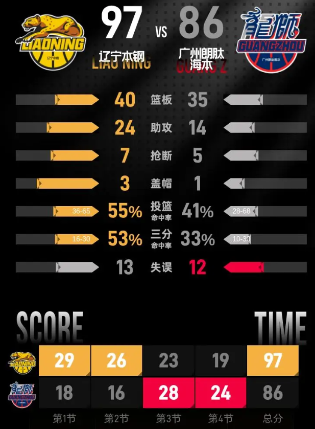 辽宁凭借外线火力和内线进攻连续打出得分高潮,早早建立起两位数的领先优势,广州进攻效率偏低,半场始终未能将分差缩小到20分以内。