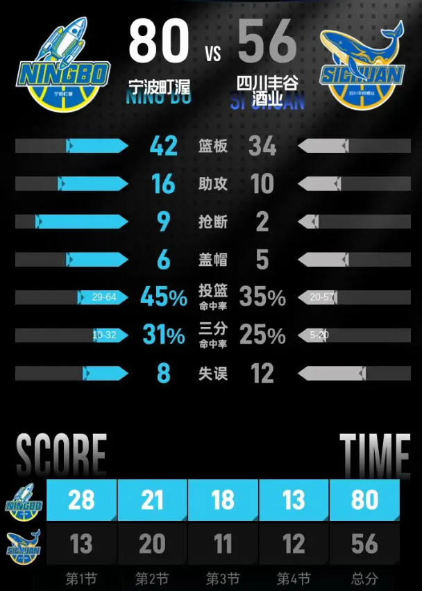 宁波町渥队:王凡懿11分4篮板、罗凯文10分2篮板2助攻、扎维尔·辛普森9分3篮板5助攻、达柳斯·贝兹利9分10篮板2助攻、塔克·法尔9分4篮板、王俊杰8分2篮板2助攻、富兰克林·杰克逊8分4篮板、戴昊7分1篮板1助攻、宁鸿宇6分5篮板2助攻、俞长栋3分3篮板、鲁吐布拉3篮板1助攻、赵建树1助攻。