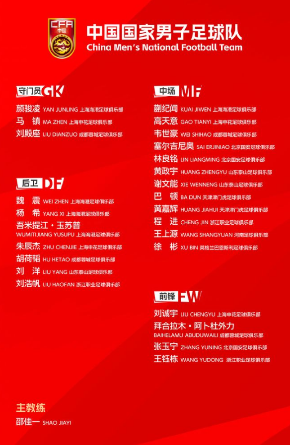 新一期国足名单公布 蒯纪闻刘诚宇马镇入选
