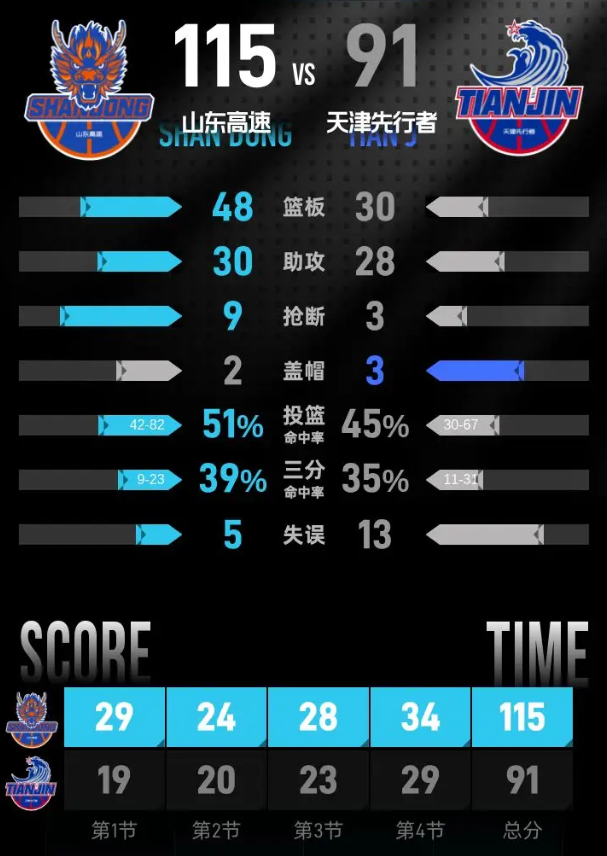 进入第四节比赛,林庭谦率先跳投拿两分,高诗岩打成2+1稳住优势,王证命中三分后,山东牢牢把分差控制在20分以上。克里斯多次在内线完成灌篮得分,王证外线手感火热,接连命中三分,比赛剩余不到五分钟时,分差已经扩大到28分。天津换下全部主力,年轻队员延续进攻节奏,接连命中三分和上篮,山东也换上替补应战。谢智杰末段上篮得分,天津替补再拿两分,全场比分定格在115-91。