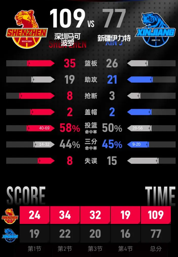 全场具体比分(深圳马可波罗队在后):19-24、22-34、20-32、16-19。