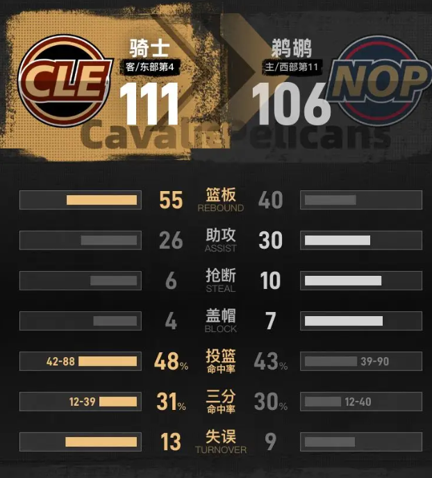 进入第四节,威廉森开场连拿4分,鹈鹕将领先优势拉开到15分。随后骑士开启追分模式,哈登连续命中两记三分,米切尔三分加上两罚全中,分差被不断缩小。哈登突破得分后再中三分,骑士把分差缩小到1分,米切尔随后上篮得分,比分交替反超,斯特鲁斯上篮命中,哈登再拿两分,骑士重新取得3分领先。莫布利扣篮得分,骑士领先7分,默里三罚全中把分差缩小到4分,梅里尔扣篮得手,威廉森罚球命中,默里补篮得分,鹈鹕把分差追到只剩2分。最后4秒米切尔突破上篮得手,加罚命中锁定胜局,骑士111-106击败鹈鹕。