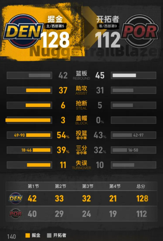 全场具体比分(掘金队在后):40-42、29-33、24-32、19-21。