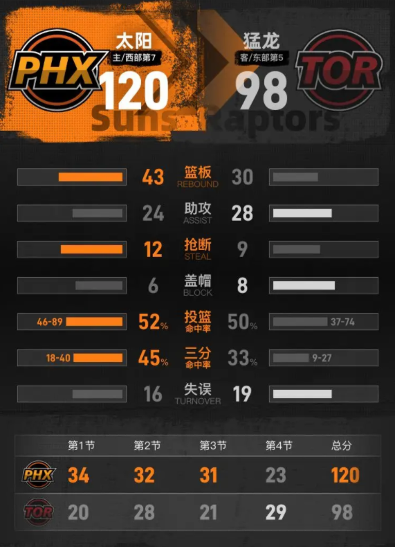 北京时间3月23日NBA常规赛,主场作战的太阳以120-98击败猛龙。布克25分3篮板6助攻,巴恩斯17分5篮板6助攻。