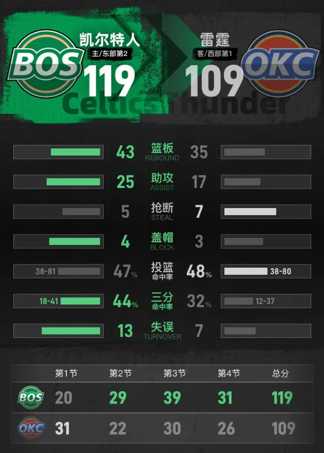 进入第四节,克塔篮下得分,豪瑟命中三分,凯尔特人把分差扩大到8分。卡鲁索连投带罚得到5分,杰伦-威廉姆斯快攻上篮得分,分差缩小到4分。凯尔特人沙伊尔曼和布朗连续得分,普理查德再中三分,分差拉开到14分。亚历山大连续罚球追分,多尔特和乔先后命中三分,雷霆把分差缩小到6分。布朗两次罚球后篮下再添两分,怀特两罚全中锁定胜局,最终凯尔特人主场119-109击败雷霆。