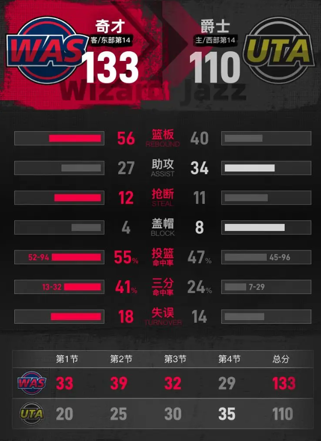 进入第四节,爵士掀起反击高潮,辛森连续命中三分,威廉姆斯在内线接连得分,不到五分钟时间,爵士打出17-4的攻击波,将分差缩小到14分。奇才及时调整稳住阵脚,里斯内线补篮得分,库珀外线命中三分,重新将分差拉开到20分以上。最后两分钟,布莱克命中三分,里斯扣篮得手,奇才稳守大比分优势,最终奇才133-110击败爵士。