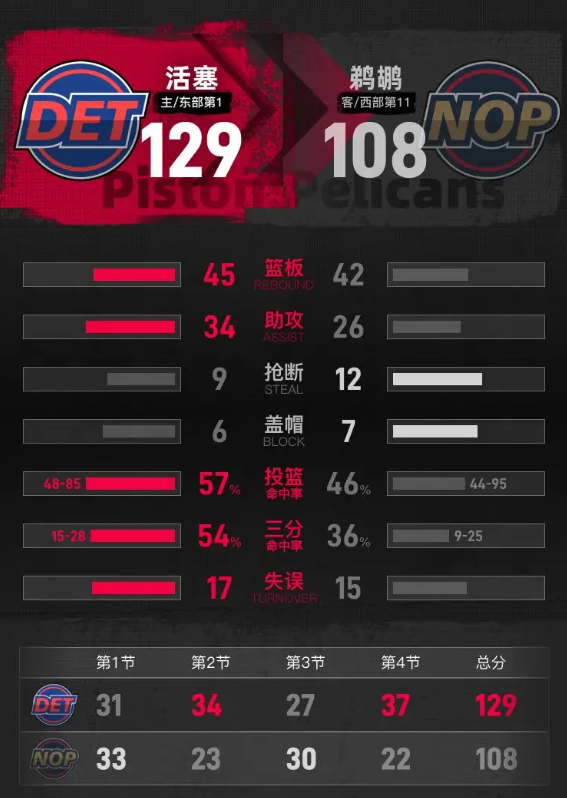 北京时间3月27日NBA常规赛,主场作战的活塞以129-108击败鹈鹕,鹈鹕遭遇3连败。杜伦30分10篮板7助攻,奎因11分11篮板2助攻。