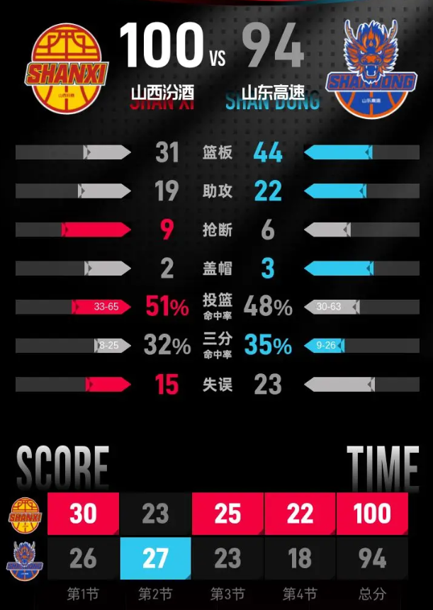 比赛进入末节,约翰逊上来就上篮扳平比分,刘东连续两次内线得分,山西重新拿到领先。陈林坚上篮得分后再命中三分,山东反超1分,双方持续紧咬。贾明儒接迪亚洛助攻命中三分,山西把分差拉开到5分,约翰逊连续拿下4分帮助山东反超1分,张宁连续两次进攻得手,山西重新拿回3分领先。最后25秒迪亚洛两罚全中,山西领先5分,陈林坚命中三分追回一分,葛昭宝稳稳两罚全中,最终山西汾酒以100-94击败山东高速。