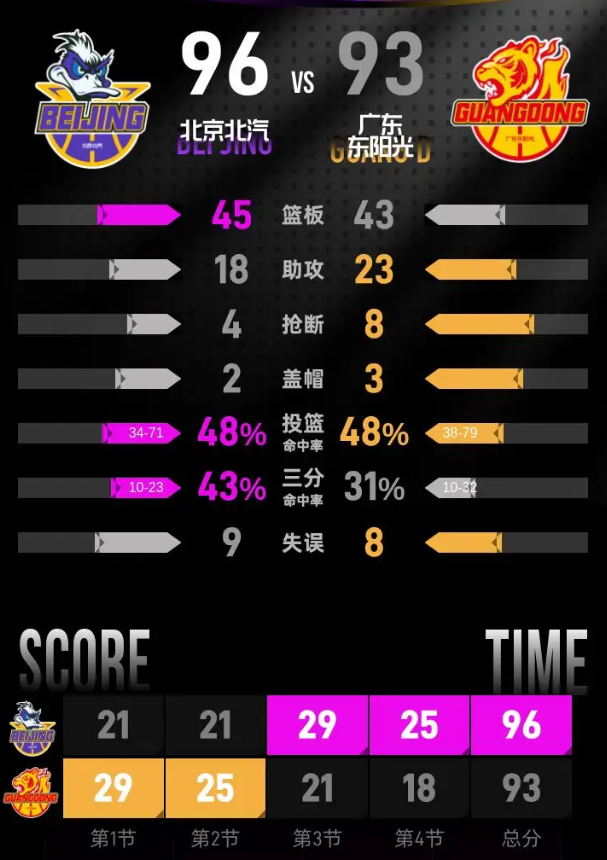 进入第四节,北京开场就连得6分,周琦接助攻跳投命中后北京将分差缩小到2分,陈盈骏跳投得分后,双方分差只剩下1分。之后比分交替上升,双方始终咬住比分,最后1分41秒杰曼接陈盈骏助攻命中三分,将比分追成90平。还剩30秒,张才仁接赵睿助攻投进三分,北京反超3分。15秒萨姆纳回应三分追平比分。最后一攻杰曼出手三分命中完成绝杀,北京北汽以96-93击败广东东阳光。