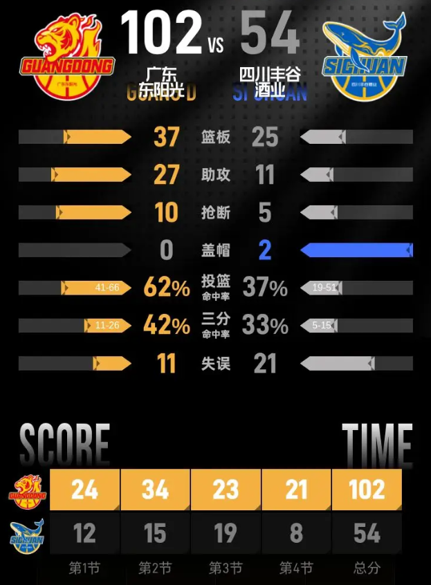 广东半场多点得分,进攻端成功率远超对手,四川进攻端连续受阻,只能依靠核心球员零星取分,大比分落后的局面让比赛早早失去胜负悬念。