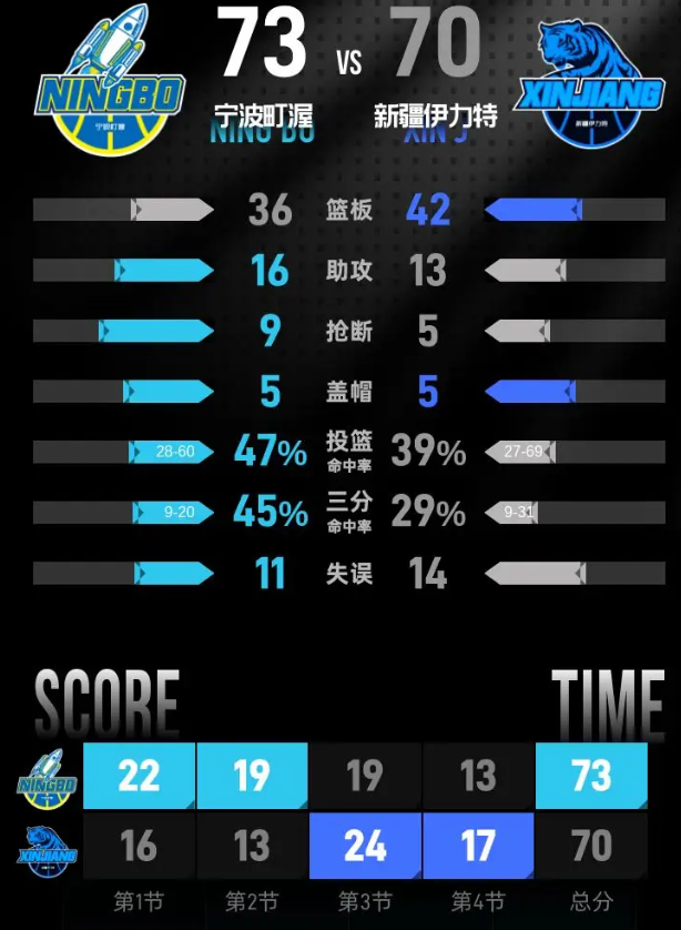 宁波町渥队:富兰克林·杰克逊21分2篮板、扎维尔·辛普森12分5篮板10助攻、罗凯文10分4篮板、塔克·法尔9分5篮板1助攻、王凡懿4分2篮板1助攻、俞长栋4分4篮板、王俊杰4分4篮板4助攻、宁鸿宇3分、鲁吐布拉3分3篮板、戴昊3分1篮板。