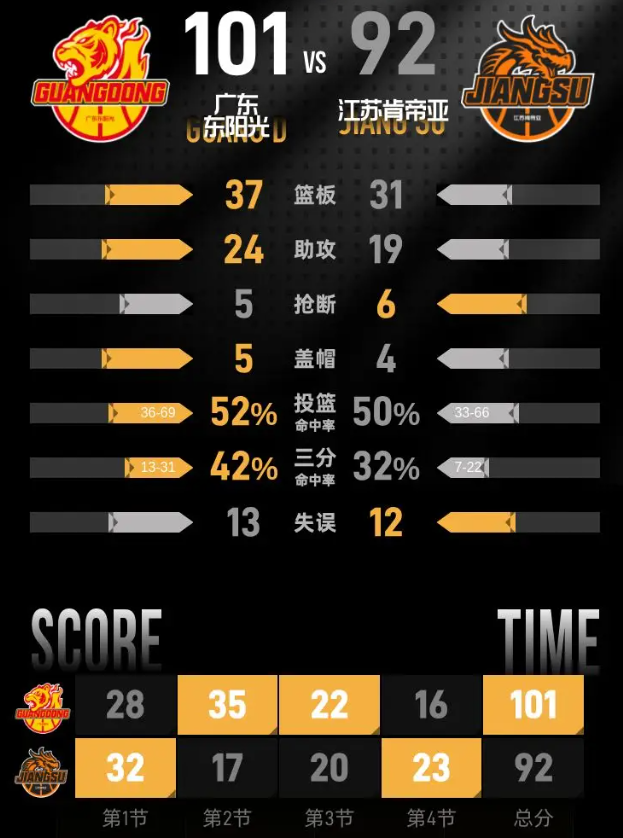 第四节开始后江苏掀起追分势头,蒋浩然率先得分,亨特和庞峥麟连续跟进取分,分差被缩小到10分。张皓嘉接徐杰助攻命中三分,徐杰也再接萨林杰助攻投进三分,重新拉开分差。庞峥麟回敬三分,刘正清也命中三分,分差一度回到个位数。张皓嘉低位跳投得分后再中三分,刘泽希回敬三分把分差追到9分,萨林杰跳投得分加罚球命中,帮助广东拿到101分。最后一分钟刘正清技术犯规罚球命中,庞峥麟上篮得分,全场比赛结束。