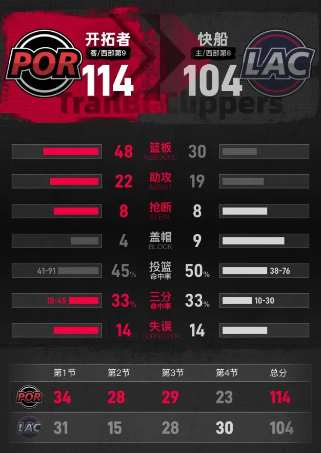 进入第四节,霍勒迪开局连得5分拉开分差,米勒和伦纳德连续得分追赶,开拓者依旧保持15分以上领先。米勒突破得分,科林斯投进三分把分差缩小到10分,阿夫迪亚突破得分重新拉开分差。洛佩斯、伦纳德接连内线得分,霍勒迪命中三分后分差回到15分。克林根扣篮得分,加兰回敬三分,科林斯补篮再次把分差缩小到10分。霍勒迪再中三分,米勒回敬三分稳住快船追分势头,乐福上篮得分后,桑德斯扣篮得到快船本场最后两分,最终开拓者客场114-104击败快船。