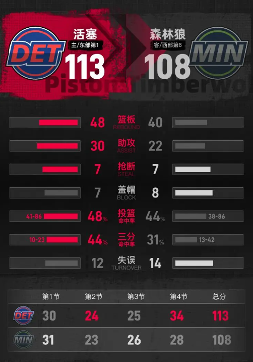 进入第四节比赛,里德开场就命中三分,森林狼扩大领先优势到4分。活塞逐步追赶,霍兰二世扣篮完成反超,杜伦两罚全中后汤普森快攻扣篮,活塞将分差拉开到5分。詹金斯连续得分稳住优势,赫尔特两罚全中后罗宾逊命中三分,活塞领先优势扩大到9分。多森姆两罚全中缩近分差,里德再中三分把分差缩小到4分,最后半分钟兰德尔上篮得分,分差只剩下2分。杜伦两罚全中,多森姆突破得分后罚中一分,詹金斯和格林先后四罚全中,最后3秒多森姆突破得分,最终活塞113-108拿下比赛胜利。