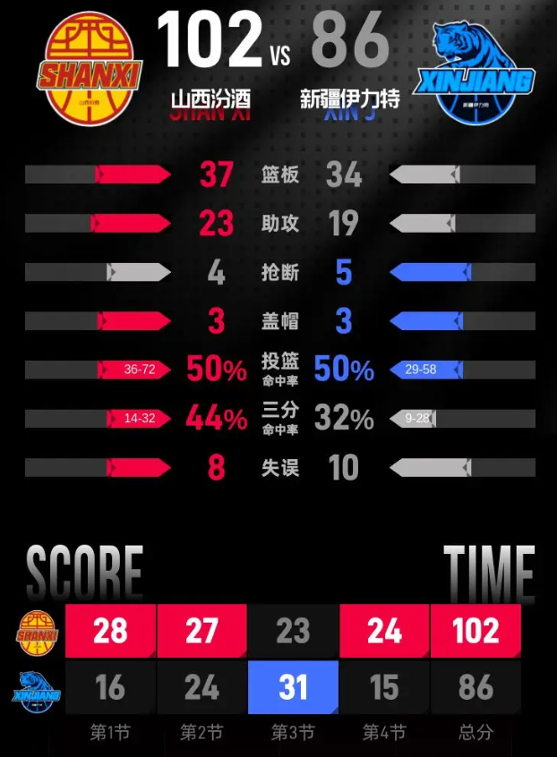 山西汾酒队:马尔科·奈特24分3篮板7助攻、贾明儒23分2篮板2助攻、葛昭宝21分8篮板2助攻、哈米杜·迪亚洛8分5篮板1助攻、于米提·赛达克7分2篮板、刘东5分2篮板2助攻、凯尔·盖伊5分1篮板2助攻、张宁4分1篮板3助攻、焦海龙3分4篮板2助攻、易卜拉希马·法耶2分6篮板2助攻。