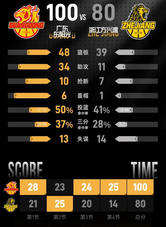第四节开始后,奎因状态依旧火热,先是接徐杰助攻投进三分,之后两次完成灌篮,徐杰也在外线投进三分,分差很快拉开到14分。浙江林秉圣连续得分缩小分差,赵岩昊接到助攻投进三分将分差缩小到13分。广东稳稳把握住优势,胡明轩两罚全中,王少杰也两罚命中,最后时刻陈家政接到奎因助攻投进三分,比分定格为100-80,广东主场收下胜利。