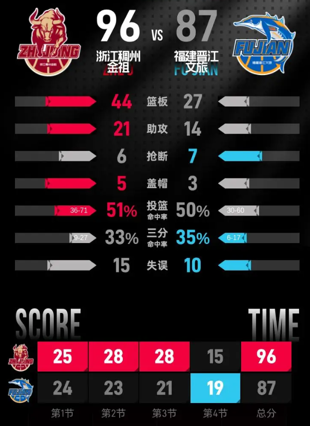 浙江稠州金租队:达卡里·约翰逊33分21篮板3助攻、布兰登·兰道夫19分3篮板3助攻、陆文博11分2篮板2助攻、李悦洲8分1篮板2助攻、程帅澎6分2篮板2助攻、达米安·琼斯5分3篮板2助攻、王仔路5分8篮板1助攻、吴前4分1助攻、安德鲁·安德鲁斯3分2篮板3助攻、张洪硕2分1篮板2助攻。