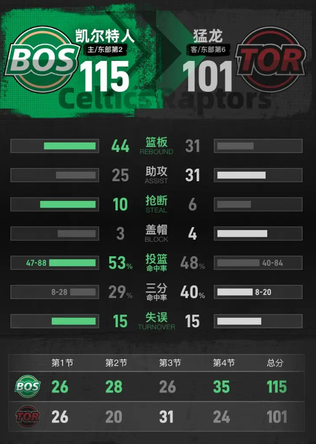 全场具体比分(凯尔特人队在后):26-26、20-28、31-26、24-35。