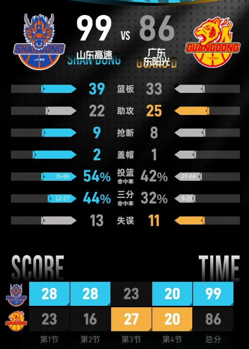 第四节开始后,许梦君和珀塞尔连续命中三分,山东将分差拉开到18分。徐杰抛投得分后,杜润旺和张皓嘉接连得分,胡明轩命中三分把分差缩小到12分。高诗岩连罚带投拿下四分稳住局势,许梦君再中三分,广东最后阶段接连追分,奎因两罚全中,张皓嘉上篮得分,广东将分差缩小到11分。终场前45秒谢智杰跳投命中,山东高速以99-86击败广东东阳光。