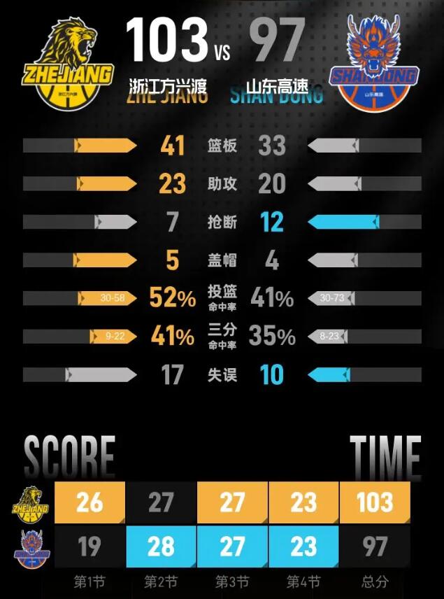 进入第四节比赛,山东发起追分攻势,高诗岩三罚全中追平比分,陶汉林内线两次得分接连扳平,珀塞尔上篮得分再次打平比分,双方交替领先始终没能拉开差距。后半段赵岩昊上篮得分拉开分差,高诗岩回敬三分缩小分差,塔克两罚全中,朱俊龙接助攻三分命中,胡金秋内线再拿两分,浙江把分差拉大到9分。最后一分钟林秉圣接塔克助攻跳投得分,领先12分的浙江稳扎稳打,山东连续投进两记三分缩小分差,最终没能完成逆转。