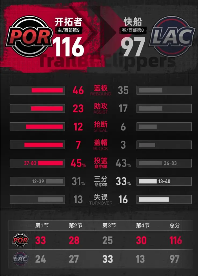 进入第四节,快船开局连得4分完成反超,开拓者迅速调整,霍勒迪两罚全中追平比分,威廉姆斯两次空切扣篮得分,阿夫迪亚连续冲击内线拿分,逐步拉开分差。洛佩斯命中三分缩小差距,阿夫迪亚连续罚中后又突破得分,分差拉开到10分,随后阿夫迪亚再中三分,分差扩大到16分,开拓者牢牢掌握比赛主动权,最终主场116-97击败快船。