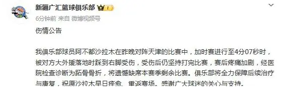 具体情况如下:在昨晚对阵天津的比赛中,加时赛进行至4分07秒时,阿不都沙拉木在与对方大外援的对抗中意外受伤,右脚被对方踩到。尽管感到剧烈疼痛,他仍然坚守比赛直到结束,但赛后痛感加重,经过医院检查确认患有跖骨骨折,因此不得不缺席随后的所有比赛。