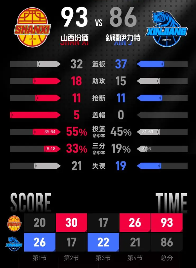 第四节开始后,焦海龙接连命中跳投,还投进三分,帮助山西再度将分差拉开到7分。新疆连续追分,李炎哲两罚全中,艾孜麦提跳投得分,很快把分差缩小到1分。你来我往之间,山西始终守住领先优势,于米提命中三分拉开分差后,迪亚洛在最后半分钟接连完成两次灌篮,将分差扩大到9分。最后时刻葛浩然命中两个罚球,新疆没能完成进一步反扑,最终山西主场收下胜利。