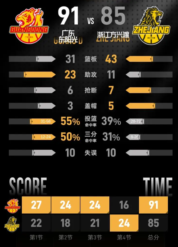 进入第四节比赛,浙江掀起反扑浪潮,布朗、胡金秋连续拿分,徐杰接连命中两记三分帮助广东稳住领先优势。布朗回敬三分后,胡金秋连续在内线得分,塔克两罚全中把分差缩小到9分。王少杰两次内线得分帮助广东重新拉开11分分差,胡金秋再进篮下,朱俊龙命中三分进一步缩小分差到8分。最后34秒赵嘉仁两罚全中把分差缩小到6分,胡明轩罚中一球后,布朗抛投得分将分差拉回5分,张皓嘉稳稳罚中第一球,最终客场作战的广东以91-85击败浙江。