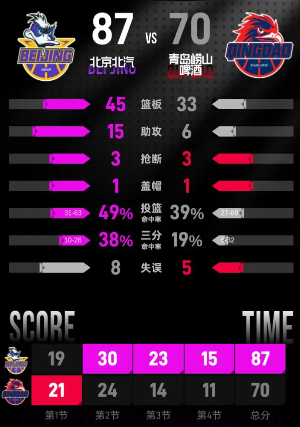 比赛进入末节,麦基在内线延续火热状态,连得4分外加一次罚球,分差很快扩大到18分。吕俊虎跳投命中加罚球为青岛打破得分荒,周琦篮下进攻再拿两分,约瑟夫·杨连续进攻得分追赶,始终没能把分差缩小到10分以内。杰曼两次快攻上篮得手,将分差拉大到19分,约瑟夫·杨再抛投命中,杰曼回敬上篮得分稳定局势。节末林韦恺两罚全中,最终主场作战的北京以87-70击败青岛。