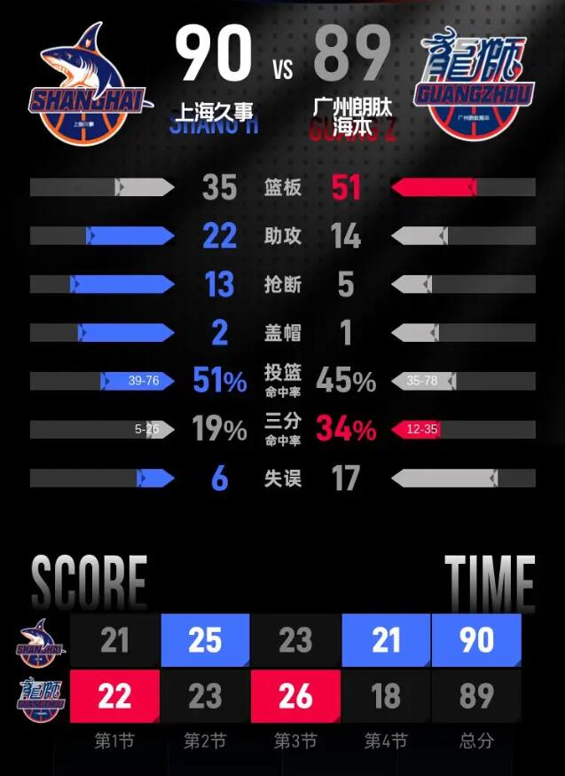 上海久事队:王哲林20分16篮板3助攻、布兰登·古德温17分4篮板9助攻、李添荣16分2篮板2助攻、张镇麟14分1篮板2助攻、闫鹏飞5分3篮板、刘礼嘉4分3篮板、刘铮4分、李弘权4分2篮板2助攻、凯尔·弗格4分1篮板1助攻、偰李永炜2分3助攻。