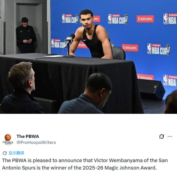 北京时间4月17日,美国职业篮球作家协会今日宣布,圣安东尼奥马刺队的维克托-文班亚马斩获2025-26赛季魔术师约翰逊奖。该奖项旨在表彰赛场表现出众,同时在对接媒体、对待球迷时兼具配合度与优雅风度的NBA球员。
