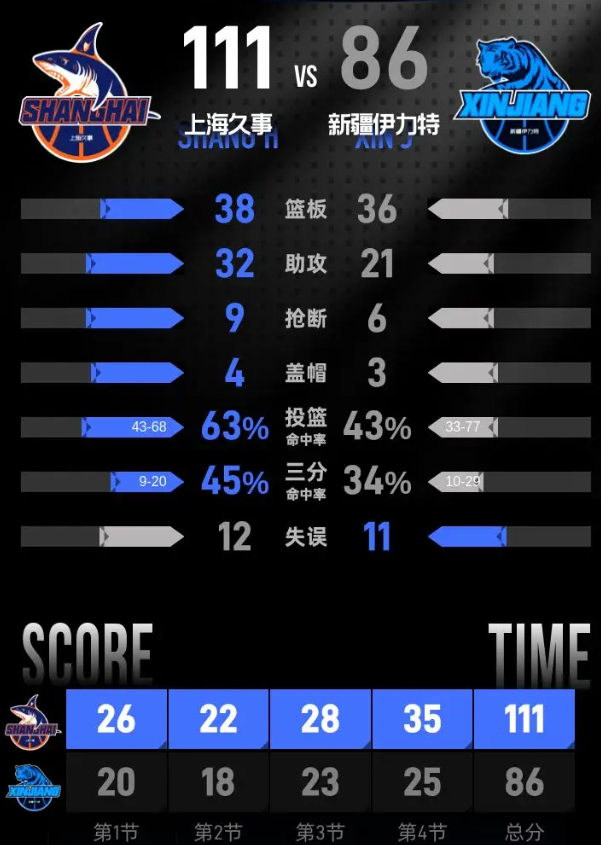比赛进入末节,上海替补阵容延续火热状态,李添荣命中三分,弗格跟进三分得手,闫鹏飞篮下得分,开场不到三分钟上海已经领先23分,早早拉开了分差。新疆尽管尝试追分,曲笑宇命中三分,艾孜麦提也投进三分,始终没能把分差缩小到20分以内。上海替补稳扎稳打,闫鹏飞多次篮下得分,李添荣续上三分,比赛最后一分钟上海已经领先28分。葛浩然最后命中一记三分,全场比分定格在111-86。
